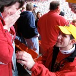 KC Wolf and I had planned the proposal to take place during the first quarter of the game, so until then I was jittery and nervous, always looking over my shoulder to see if he was heading our way. I kept feeling inside the right-front pocket of my jeans to be sure that I had remembered the ring. I made up some story to tell Jodi about how I had entered her into a seat upgrade contest for the game, hoping to pull one over on her when the Wolf would run down our aisle holding the huge poster with her name on it.