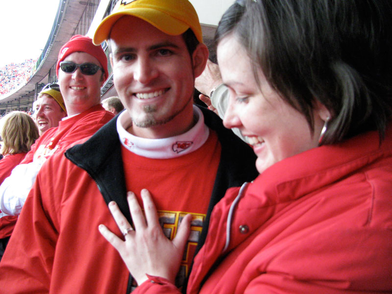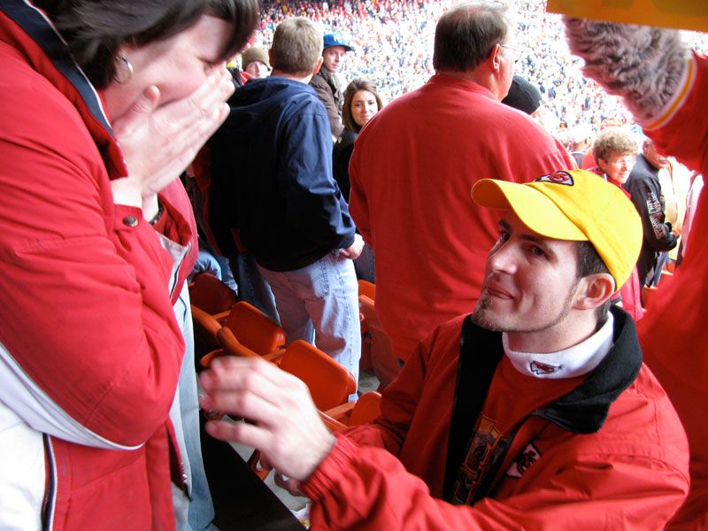 From the moment I decided to ask Jodi to marry me, I knew exactly how and where to do it. Jodi and I share a special love for our Kansas City Chiefs, having been present at countless home games before we were together, and many more since then, the tough part was figuring out how to make all my fantasies about proposing to her a reality. She’s not quite the type of woman that would like a romantic proposal at some five-star restaurant, but rather the type being surrounded by a sea of excited, angry, and sometimes vulgar, Chiefs fans adorned in her favorite color (red) at Arrowhead Stadium. That’s our idea of heaven!