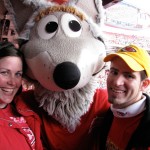 It took me a minute to figure out what was going on, he had a huge poster with my name on it, and tons of people were yelling and cheering. I looked at Rick, and he was smiling saying maybe I had won the seat upgrade, and we should go check it out. I looked back at KC Wolf farther down the aisle, and he was turning around, I saw the backside of the poster and made out the word “marry”. I turned back to Rick and said something like “are you kidding me?” Karen and Bob, the season ticket holders next to us, had broken out their camera and were pushing me down the aisle to meet KC Wolf. When I got to the end of the aisle I think KC Wolf hugged me, and then I remember Rick getting down on one knee and asking me to marry him. I of course said yes, hugged and kissed him, then took a couple of pictures with KC Wolf where my face is as red as my coat!